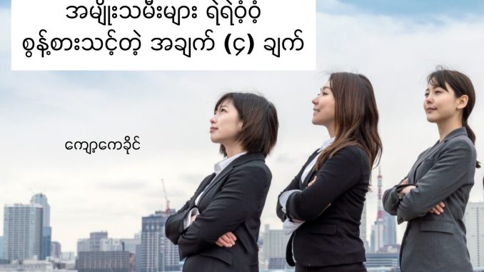အကယ်၍ သင့်စိတ်ထဲမှာ “ဒီနေရာကို ရောက်ဖို့ နင်က ဘာမို့လို့လဲ”၊ “အခုချိန်က အချိန်ကောင်းမဟုတ်ဘူး”၊ “နင်က အရည်အချင်းမရှိပါဘူး” ဆိုတဲ့ အသံတွေ ကြားနေရတယ်ဆိုရင် သင်တစ်ယောက်တည်း မဟုတ်ပါဘူး။ဒါပေမဲ့ အဲဒီသံသယတွေရဲ့ အောက်ခြေမှာရှိတဲ့ အမှန်တရားကို သင်ယုံကြည်ဖို့ လိုအပ်ပါတယ်။ အဲဒါကတော့ “သင့်မှာ သီးခြားထူးခြားတဲ့ အရည်အချင်း၊ အမြင်နဲ့ ပညာရပ်ဆိုင်ရာ ကျွမ်းကျင်မှုတွေ ရှိနေတယ်” ဆိုတာပါပဲ။ဒါဟာ အမျိုးသားတွေကို ဆန့်ကျင်တာ မဟုတ်သလို၊ “အနာဂတ်ဟာ အမျိုးသမီးတွေအတွက်ပဲ” လို့ ပြောနေတာလည်း မဟုတ်ပါဘူး။ ကျွန်မတို့ဟာ အတူတကွ ပူးပေါင်းဆောင်ရွက်ပြီး တက်လှမ်းကြရမှာပါ။ အခု ကျွန်မ တိုက်တွန်းချင်တာကတော့ အမျိုးသမီးတွေအနေနဲ့ ကိုယ့်ရဲ့ တန်ဖိုးကို နှစ်ဆမြှင့်တင်ပြီး၊ ကိုယ့်ရဲ့ အားသာချက်တွေပေါ်မှာ မားမား မတ်မတ်ရပ်တည်ဖို့ပဲ ဖြစ်ပါတယ်။ရဲရင့်ခြင်းဆိုတာ ခံစားချက်မဟုတ်ပါဘူး။ ဖြတ်ချက်တစ်ခုပါ။ အောက်ပါ စွန့်စားမှု ၄ ချက်ကို ပြုလုပ်ခြင်းဖြင့် သင့်ရဲ့ စွမ်းအားတွေကို ပြန်လည်ရယူလိုက်ကြပါစို့။