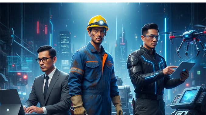 AI-Enhanced (New Collar Workers): စက်ရုံတစ်ရုံတွင် စက်ရုပ်လက်မောင်း (Robotic Arm) များ၊ AI ဖြင့်လည်ပတ်သော စက်များ ကို ကြီးကြပ်ထိန်းချုပ်ရန်၊ ပြုပြင်ရန်နှင့် AI စနစ်အား အချက်အလက် (Prompt) ပေးရန် တတ်မြောက်သော လုပ်သားများ လိုအပ်လာမှာဖြစ်ပါတယ်။ ၎င်းတို့သည် New Collar Workers
